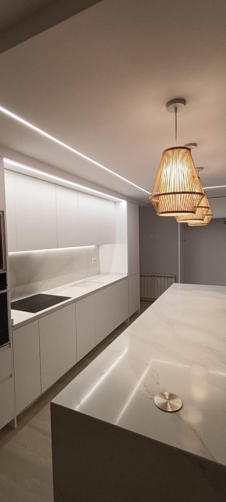Durante el proceso de reforma, estudiamos a fondo la distribución original del piso para optimizarla sin perder funcionalidad. Se realizaron cambios clave en tabiques, ampliación de zonas de paso y mejoras técnicas que permitieron una circulación más fluida y una mejor entrada de luz natural. Cada fase fue coordinada con precisión para asegurar que materiales, texturas y acabados mantuvieran coherencia con el diseño planteado desde el inicio.