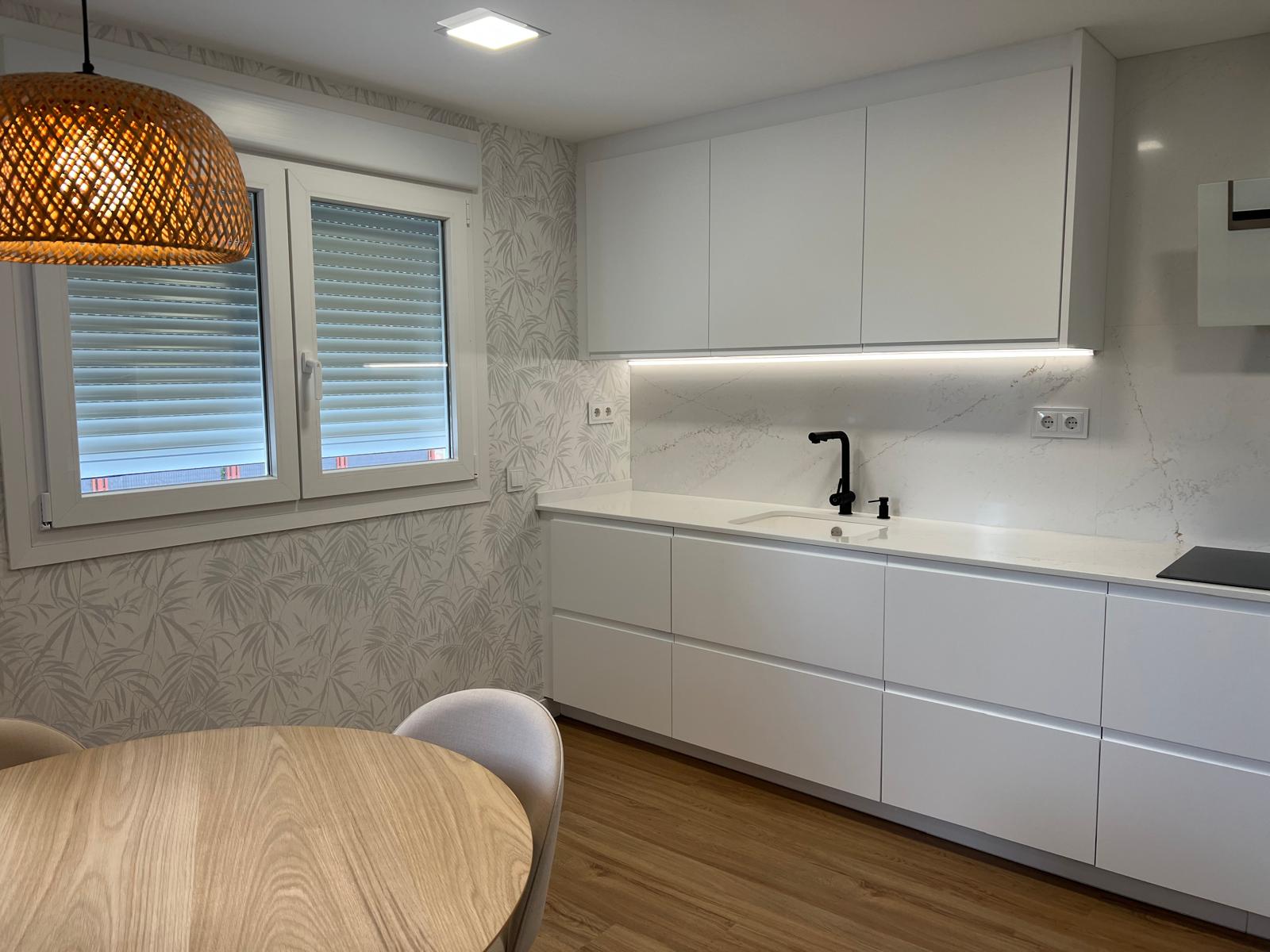 Durante el proceso se realizaron intervenciones estructurales para ampliar las áreas sociales y mejorar la comunicación entre cocina, comedor y salón. También se renovaron instalaciones, se optimizó la iluminación y se incorporaron soluciones personalizadas de almacenamiento. Cada fase se ejecutó de forma coordinada para mantener la esencia del proyecto y garantizar un resultado funcional y estético.